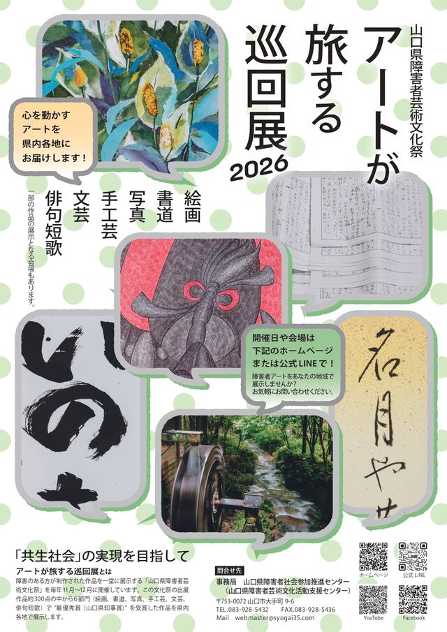 毎年11月~12月に開催している山口県障害者芸術文化祭で各部門(絵画、書道、写真、手工芸、文芸、俳句短歌)の最優秀賞を受賞した6点を県内各地で展示します。